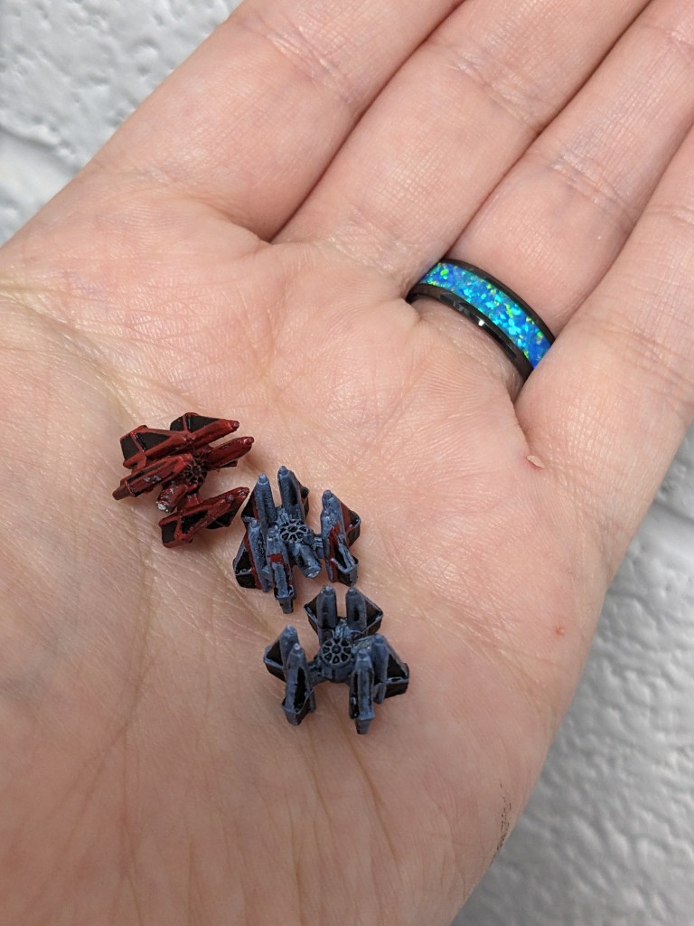 Getting into it, there will be a few schemes used here today. I personally like my named Imperial characters flying red TIEs. This is found most recently in X Wing Miniatures but exists in other sources. I like to have the two wingmen be a veteran scheme as well so help that Squadron really standout in giant games where hundreds are possibly present. Lastly, there are the blue grey and grey schemes seen throughout as well.