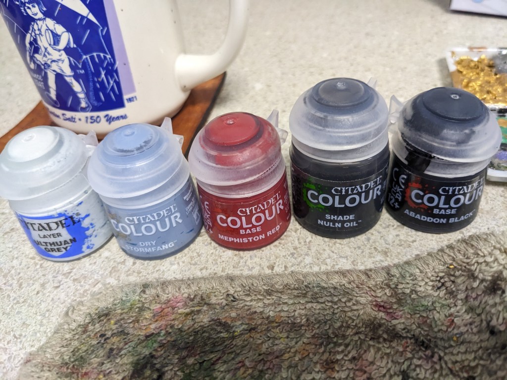 We will be using Base Abaddon Black, Layer Ulthuan Grey, Dry Stormfang, Base Mephiston Red, and Shad Nuln Oil from Games Workshop. This is not a sponsorship or promotion, I just simply like their paints.