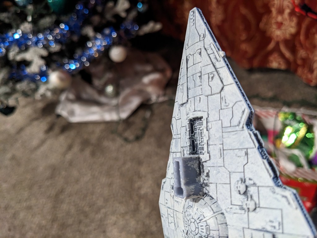 Next, heavily dry brush the entire ship in Layer Ulthuan Grey, which at this point I might as well start calling Star Wars Grey (but I really won’t). Someone came up with slap chopping, which is basically the same thing. Just get some paint on your brush (use another wide one), wipe the excess off, and slap drag it across the ship. Then dip, wipe, repeat until you get the density you want. I personally find a nice soft brush to do the best at skipping the plating gaps, but you may find it some what lacking around gun emplacements.