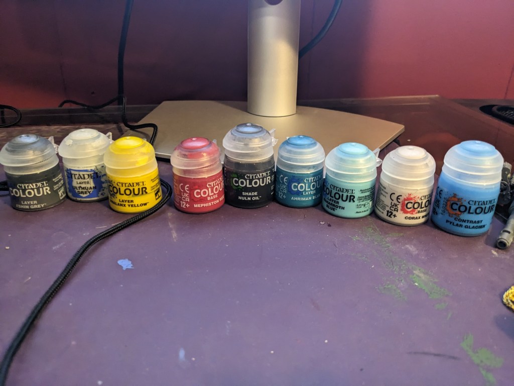Today we will be using Games Workshop paints. This is not a promotion or sponsorship. I just like their paints. We will be using Layer Eshin Grey, Layer Ulthuan Grey, Layer Phalanx Yellow, Base Mephiston Red, Shade Nuln Oil, Layer Ahriman Blue, Layer Baharroth Blue, Base Corax White, and Contrast Pylar Glacier.