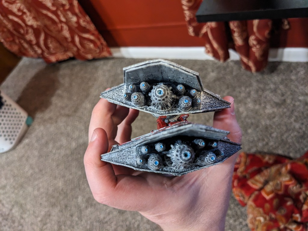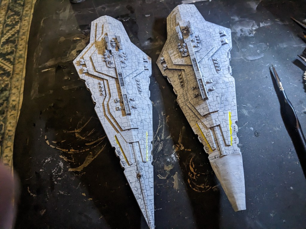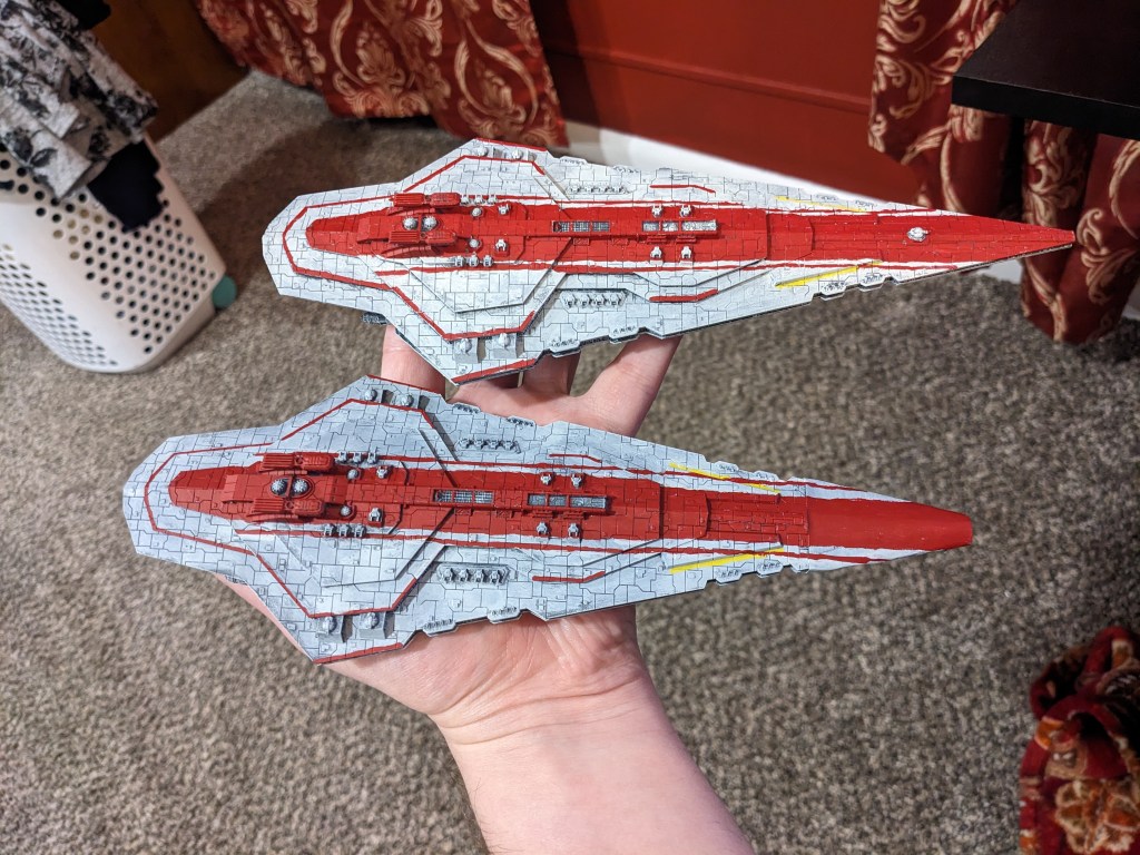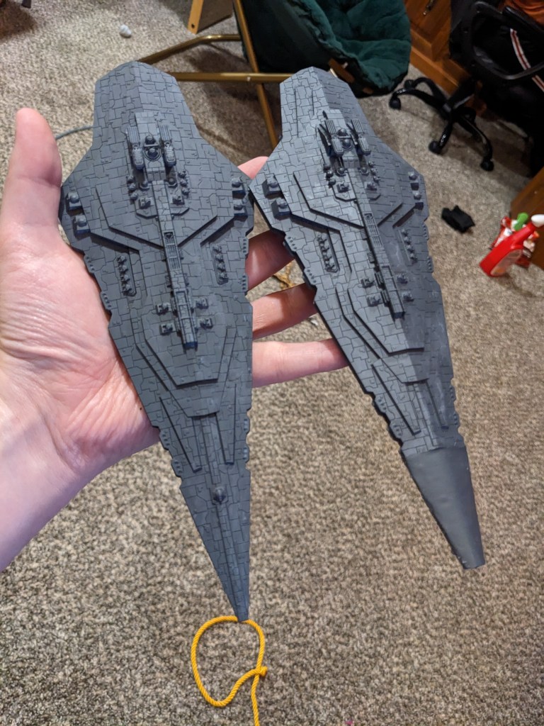 Now you will notice that one of them has an incorrect prow. The 3d print my friend did failed, but it still looked pretty good so I made one out of hobby sticks and paper. It’s not perfect, but it will do for my personal collection. At some point I will go back and add damage and smoke effects to it to hide it better.