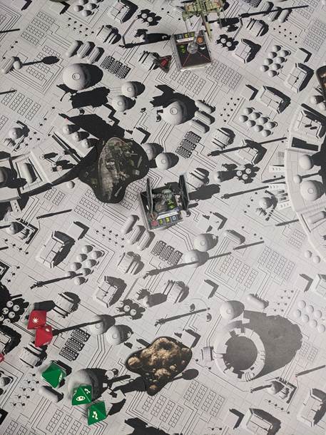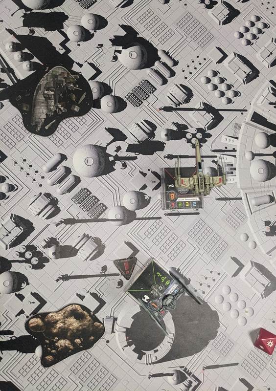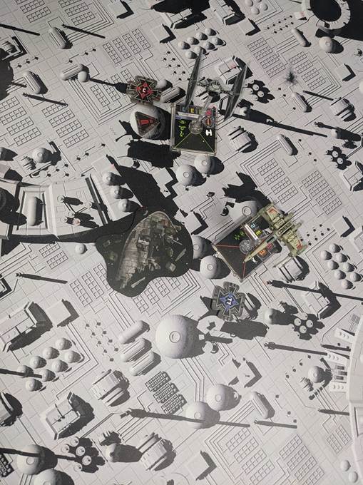 Luke was enjoying a joy ride in his newly used X-Wing. Sure the Death Star was about to blow up Yavin 4, but the rebels were handing out free military grade fighters and the princess was hot. So he found himself scooting along the surface of the Death Star at an appreciable speed when a pair of TIE Fighters came howling towards him! He positioned himself to fly in between some debris to make the engagement harder for the numerically superior Imperials.