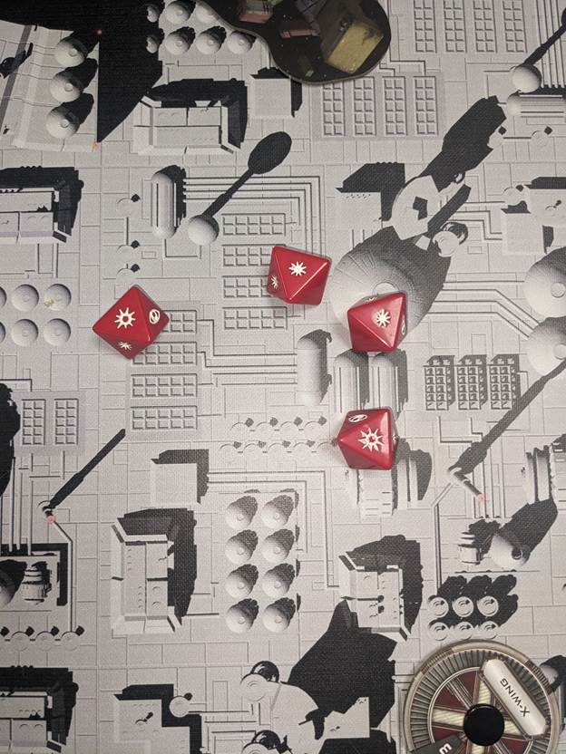 Luke pushed his fighter to its limits. He sighted the first TIE and fired at long range with surprising accuracy! (Seriously, 2 crits and a 1 hit on 3 dice). The TIE pilot desperately spiraled and evaded, managing to survive without a scratch!