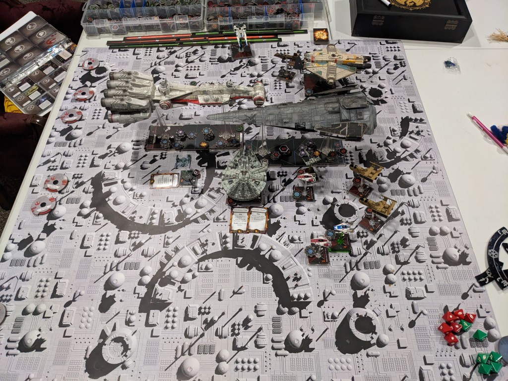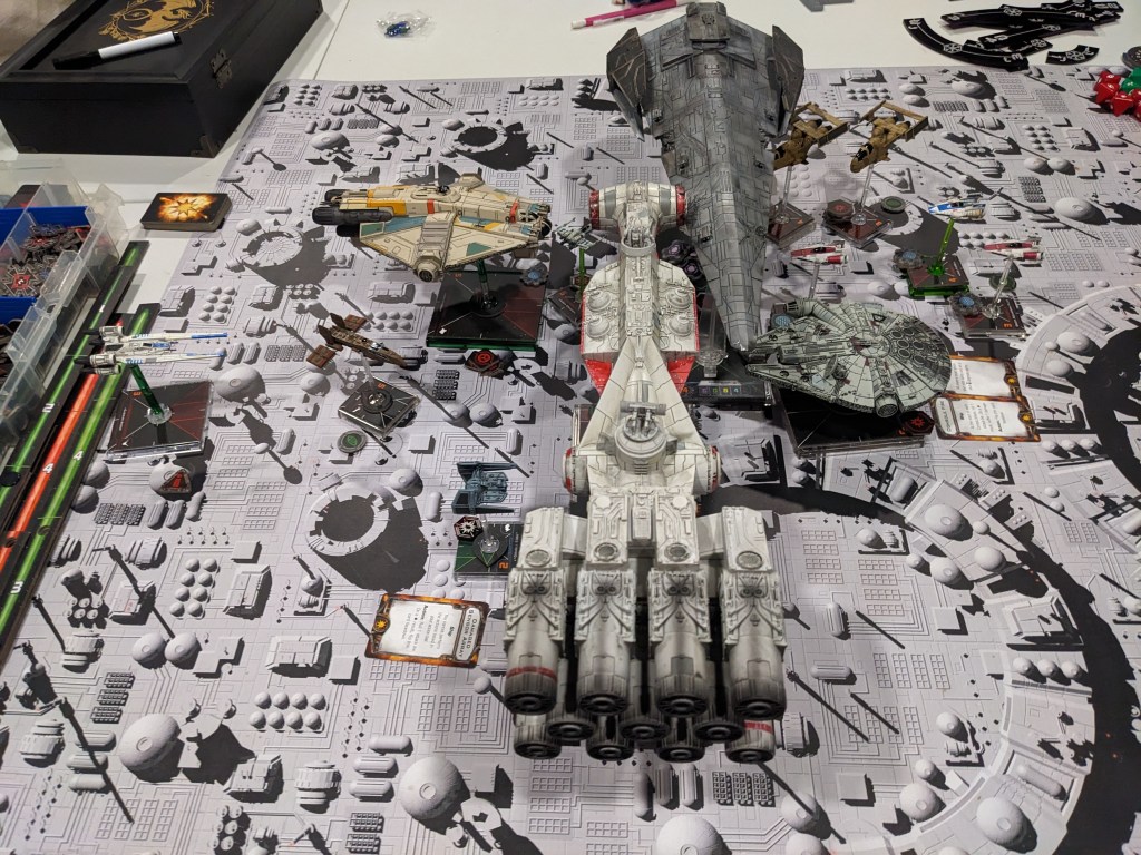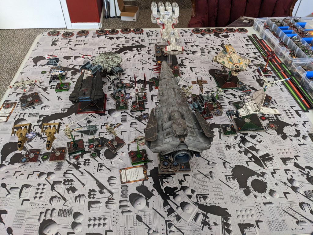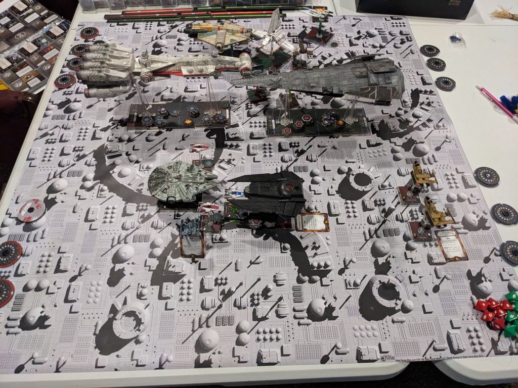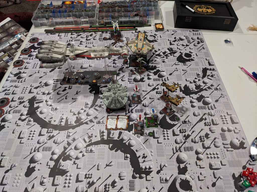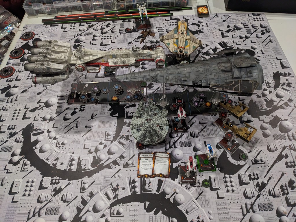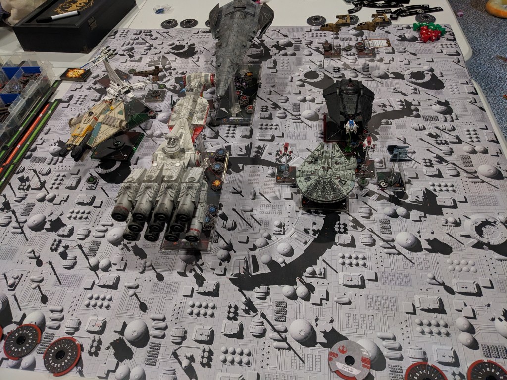 Rebels moved their gunboats up a bit slower now, providing heavy fire against the swarm bearing down on them! X Wings pulled some G’s and began a torpedo attack run on the Raider! E wings followed suit, doing their best to weave through the TIE swarms. For support, the Z-95s did their best to join as well.