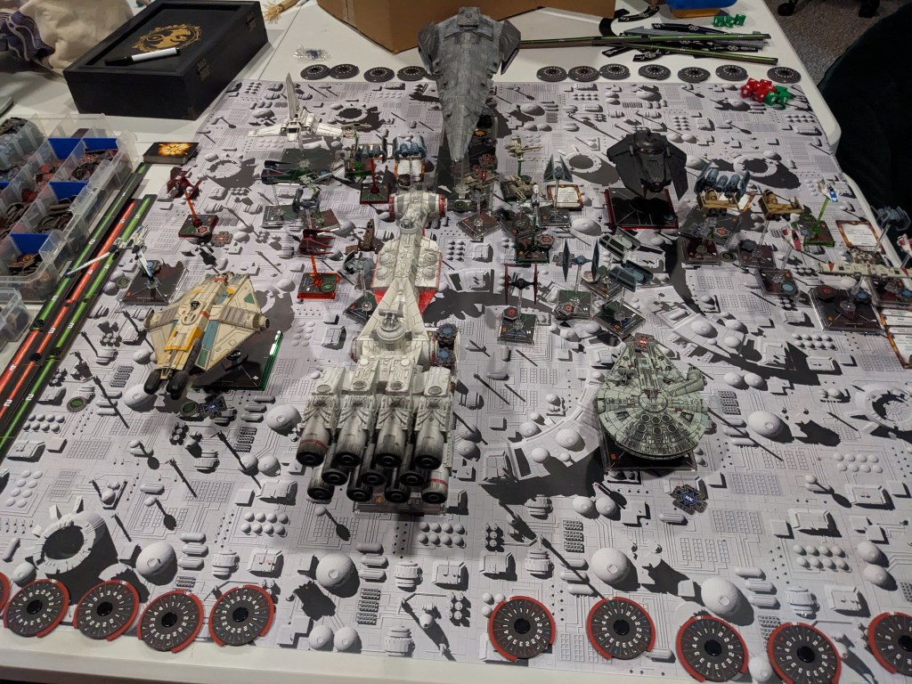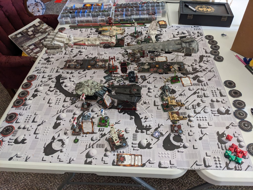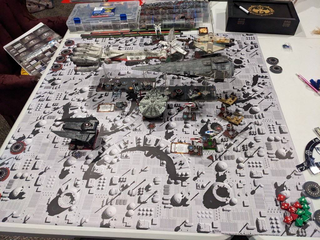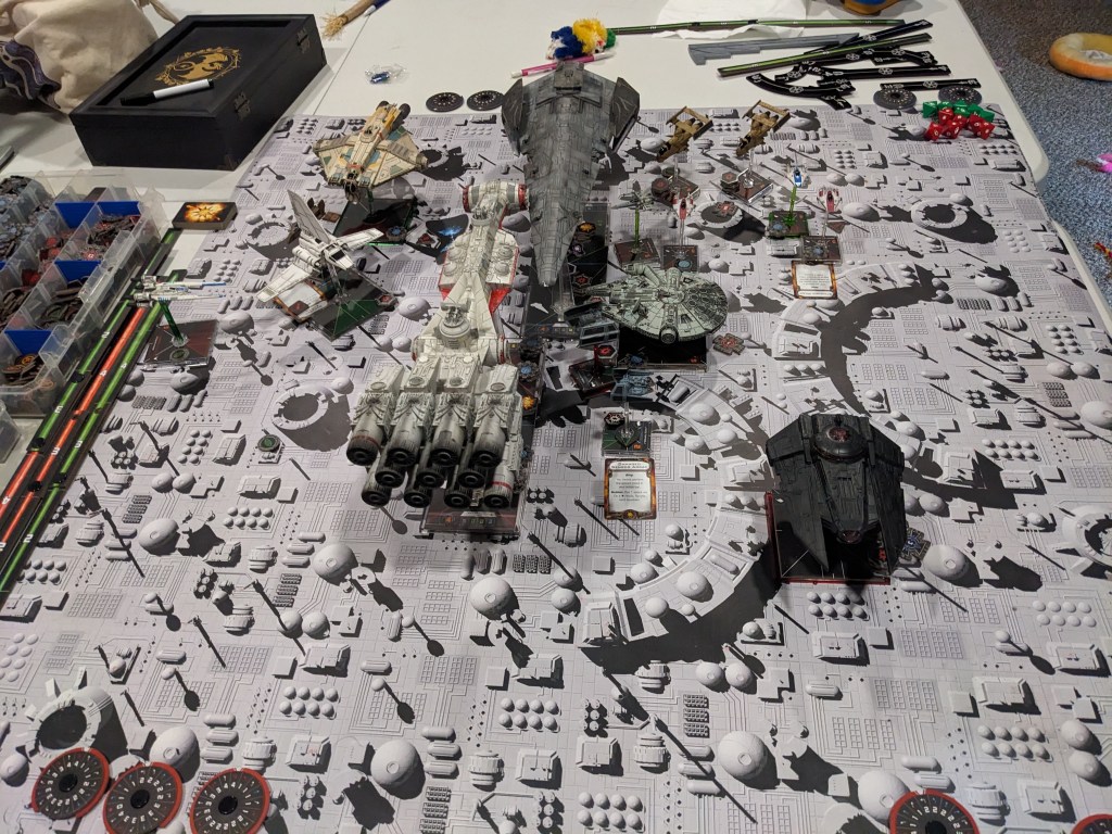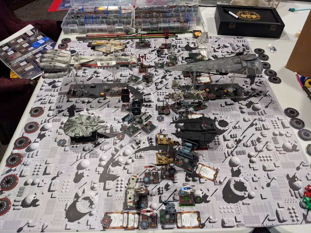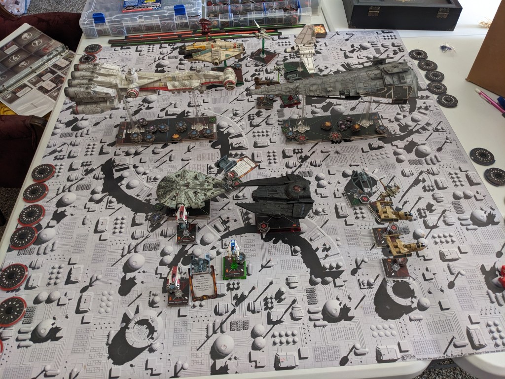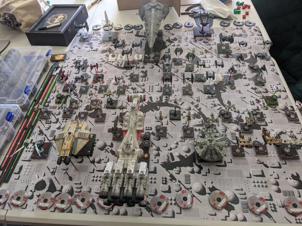 Rebels moved their gunboats up a bit slower now, providing heavy fire against the swarm bearing down on them! X Wings pulled some G’s and began a torpedo attack run on the Raider! E wings followed suit, doing their best to weave through the TIE swarms. For support, the Z-95s did their best to join as well.