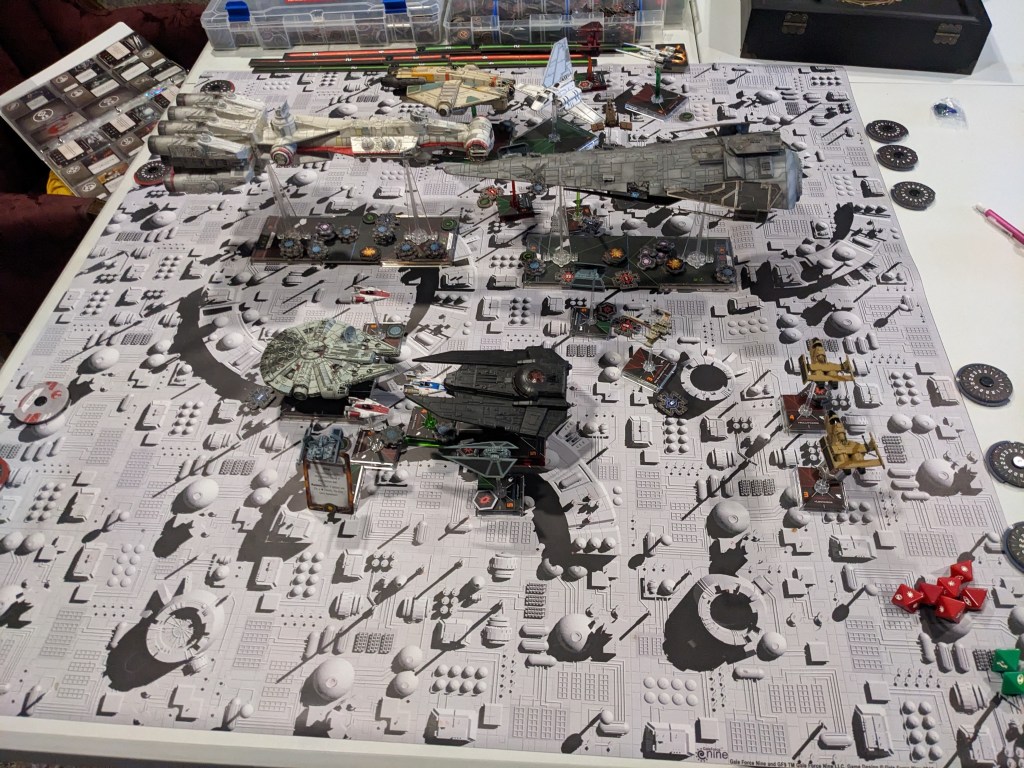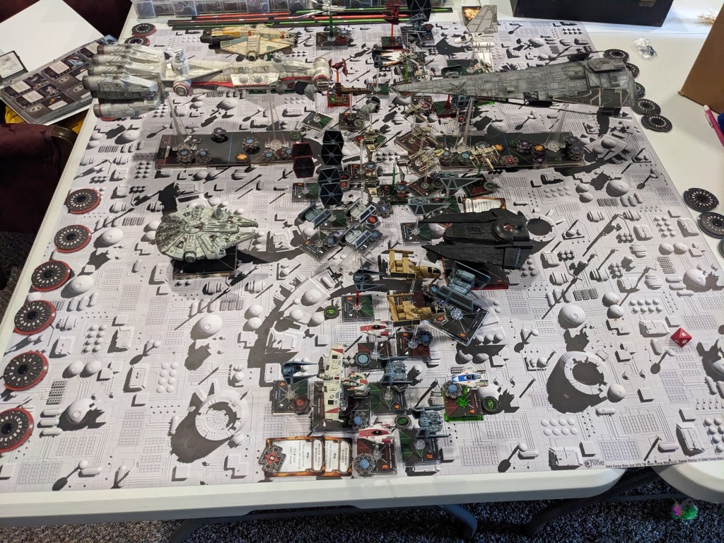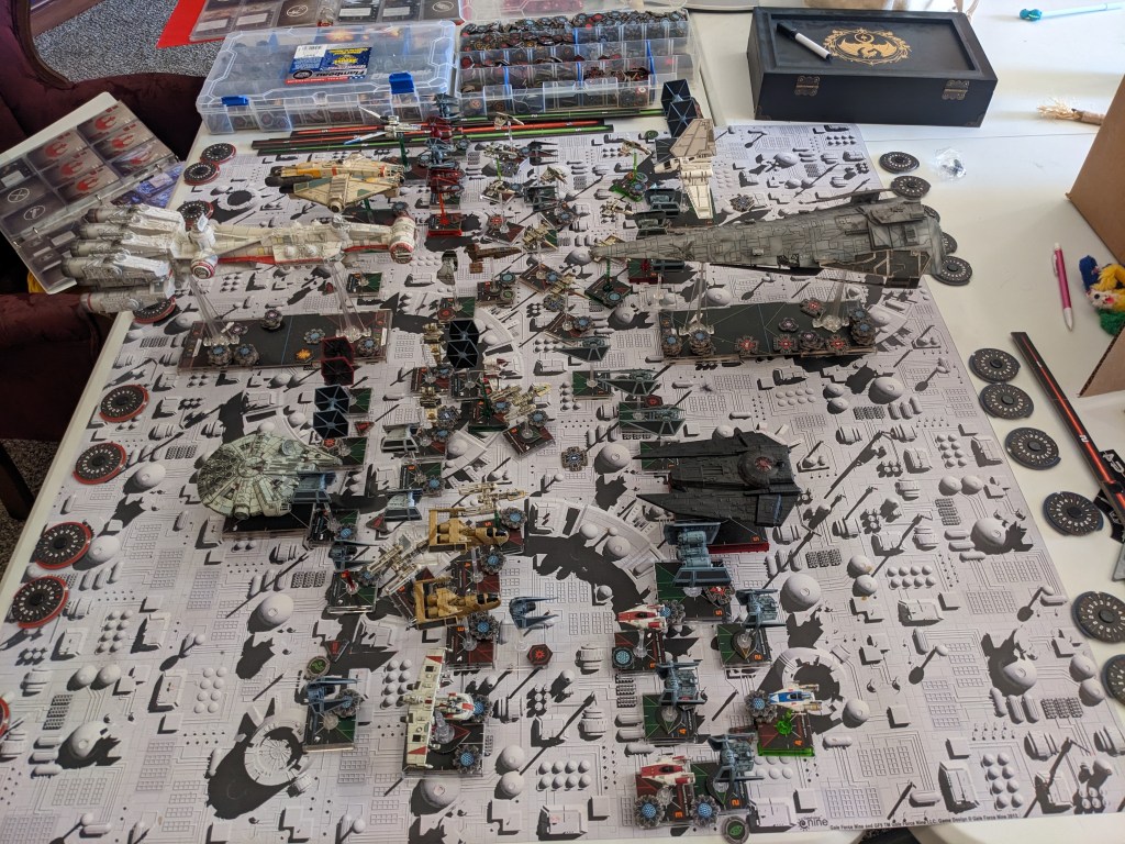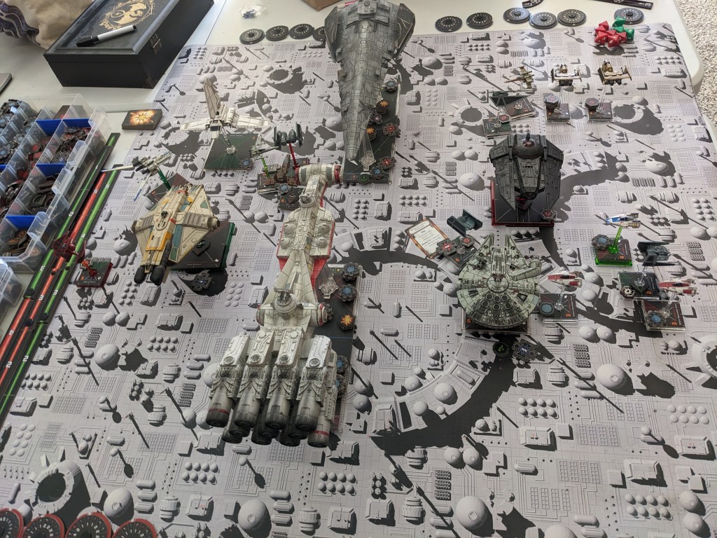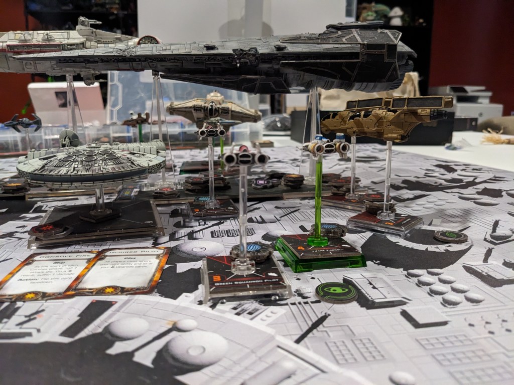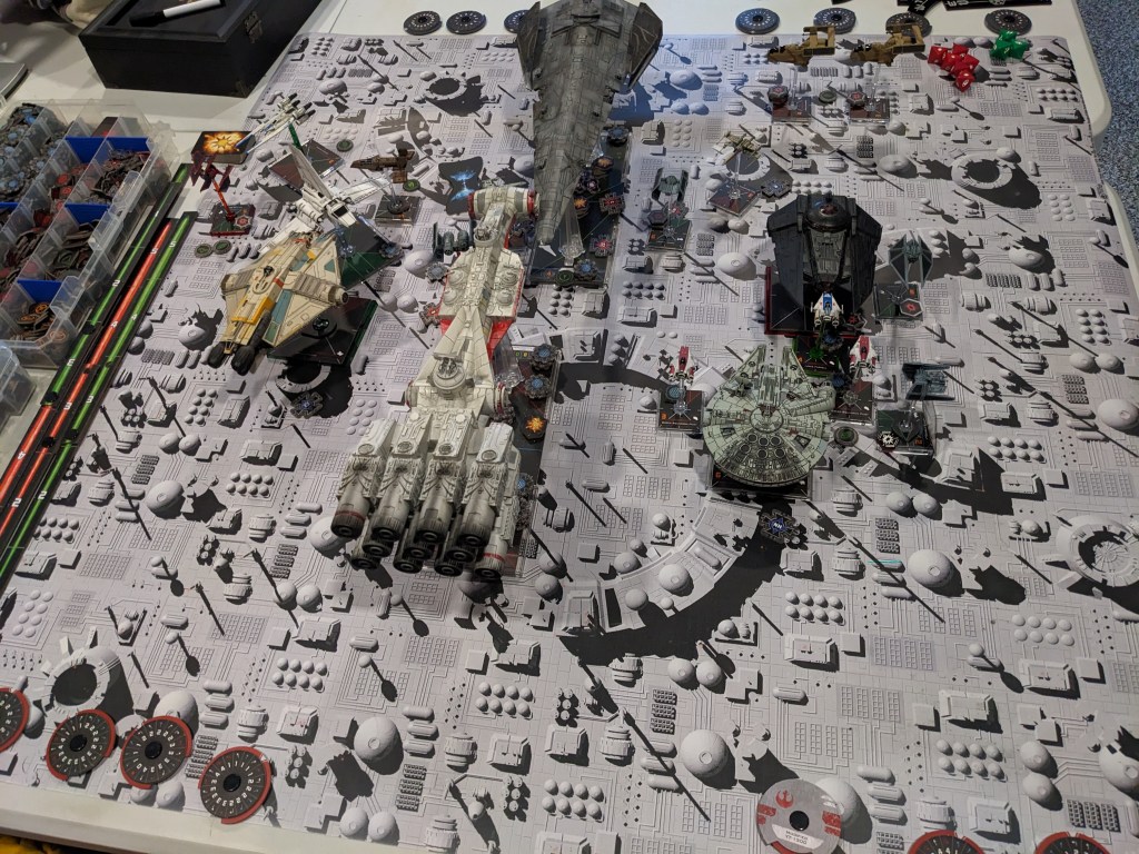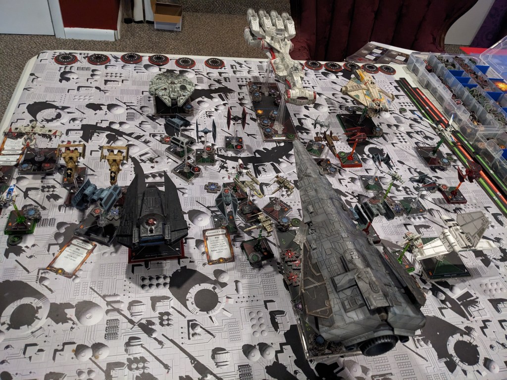 Rebels moved their gunboats up a bit slower now, providing heavy fire against the swarm bearing down on them! X Wings pulled some G’s and began a torpedo attack run on the Raider! E wings followed suit, doing their best to weave through the TIE swarms. For support, the Z-95s did their best to join as well.