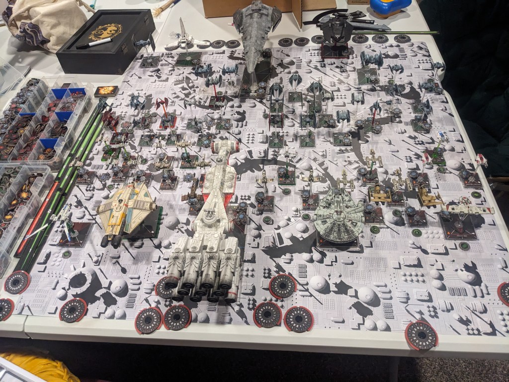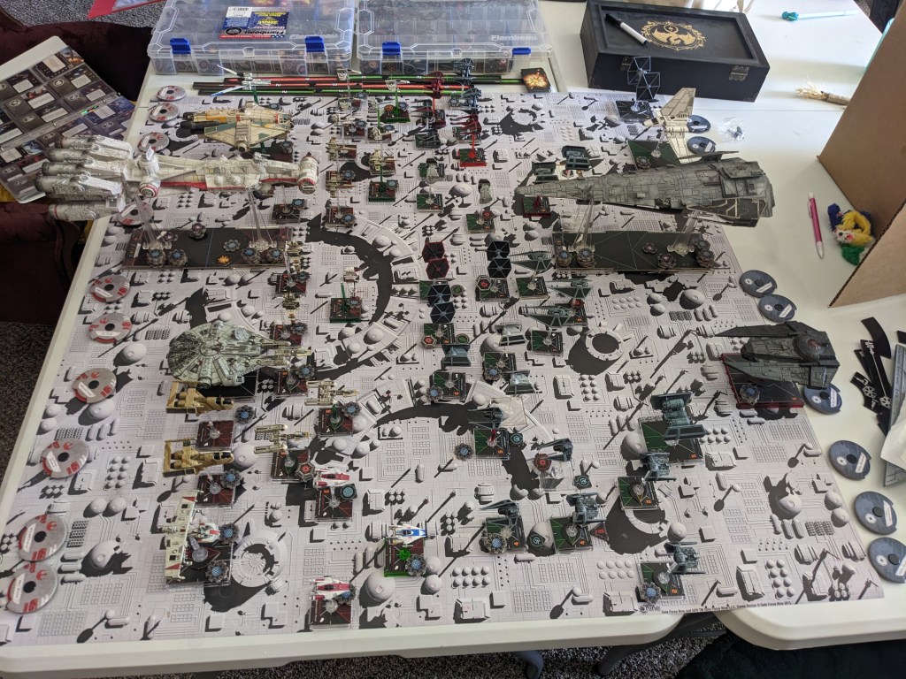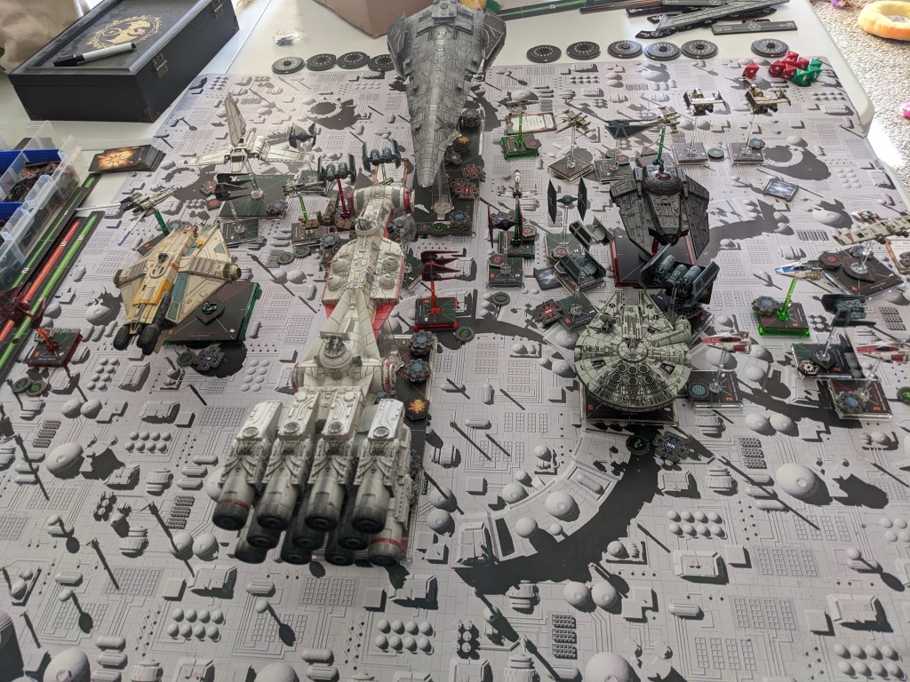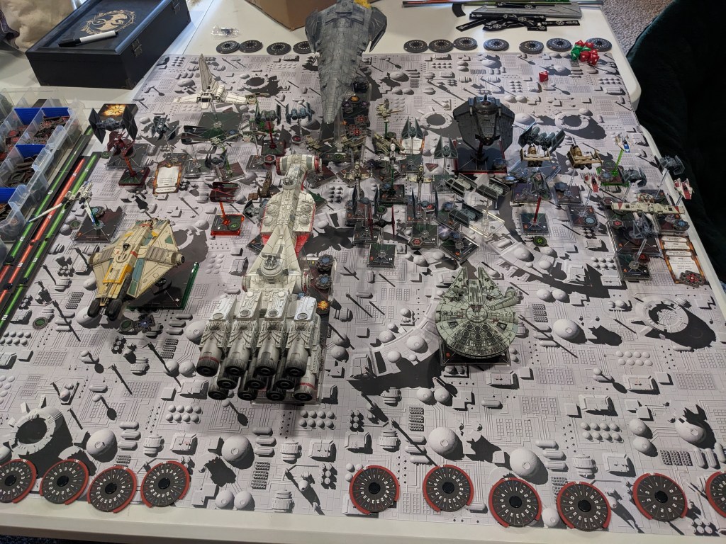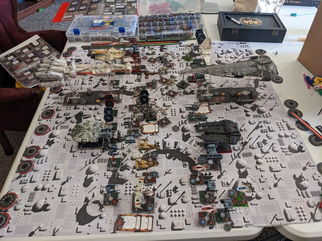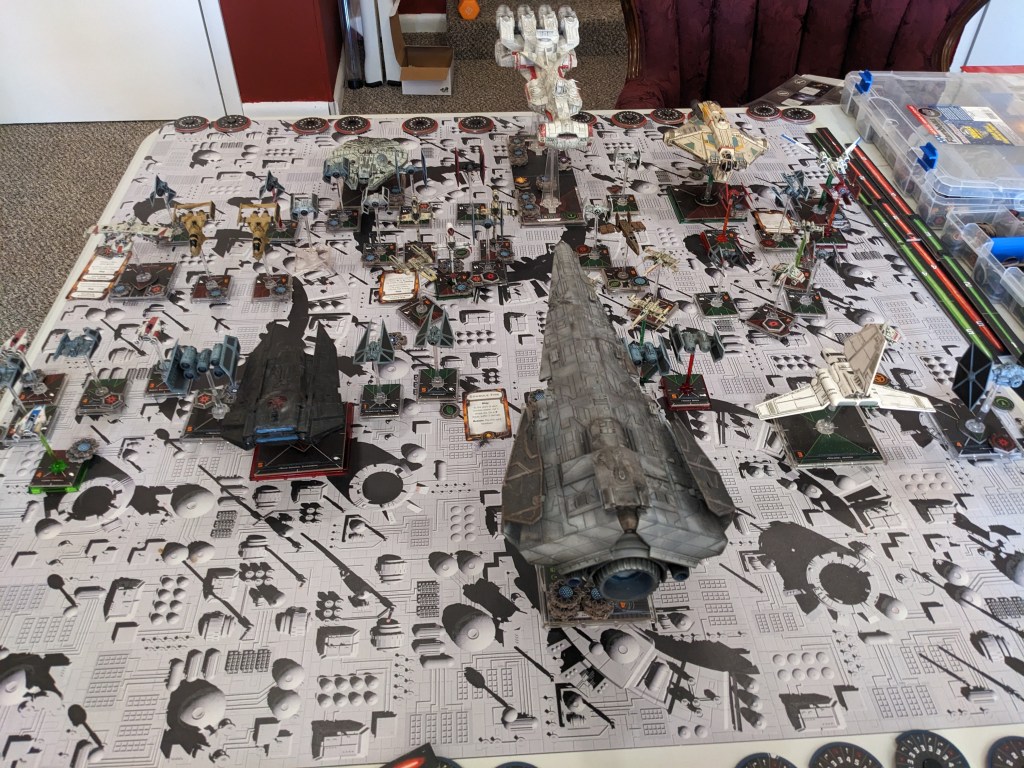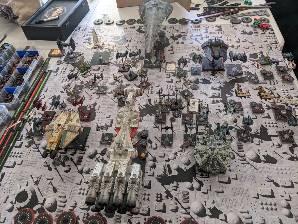 Rebels moved their gunboats up a bit slower now, providing heavy fire against the swarm bearing down on them! X Wings pulled some G’s and began a torpedo attack run on the Raider! E wings followed suit, doing their best to weave through the TIE swarms. For support, the Z-95s did their best to join as well.