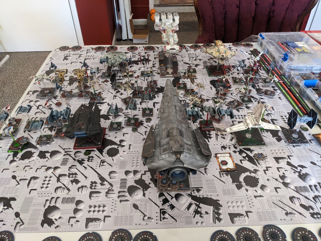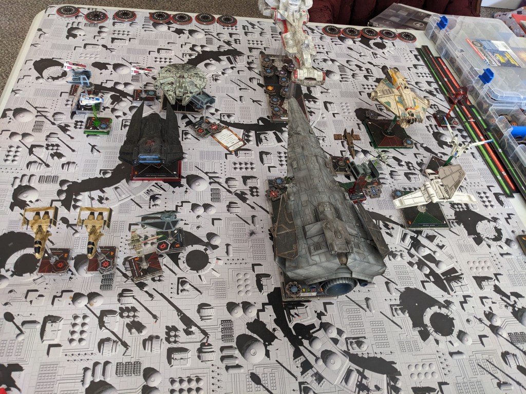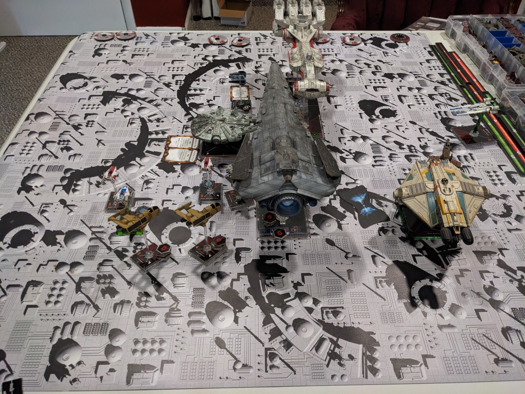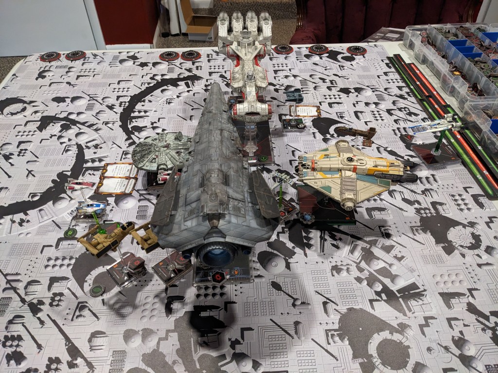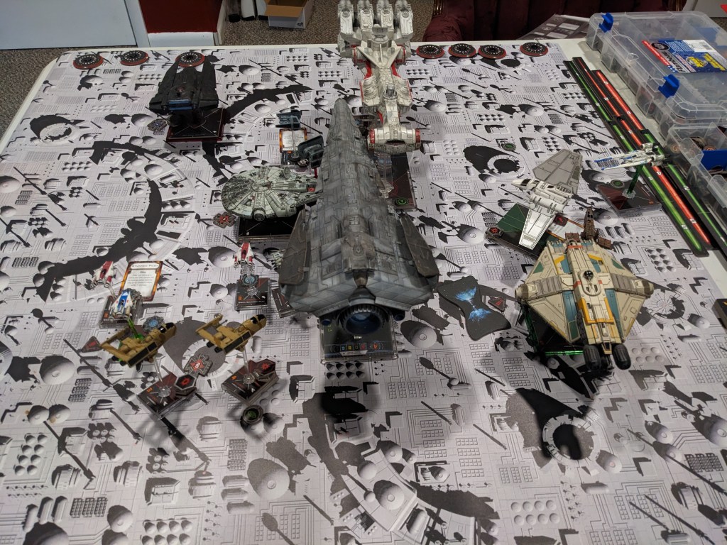 Rebels brought a squadron or single medium+ sized ship for most ship types lead by a unique hero and a CR-90. This ran at 1300 points and some change, perfect for testing Epic ship points designed to run at a 1 to 500 point ratio, with the CR-90 equaling 2 Epic Points. Being congested, I expected to see some massed firing.