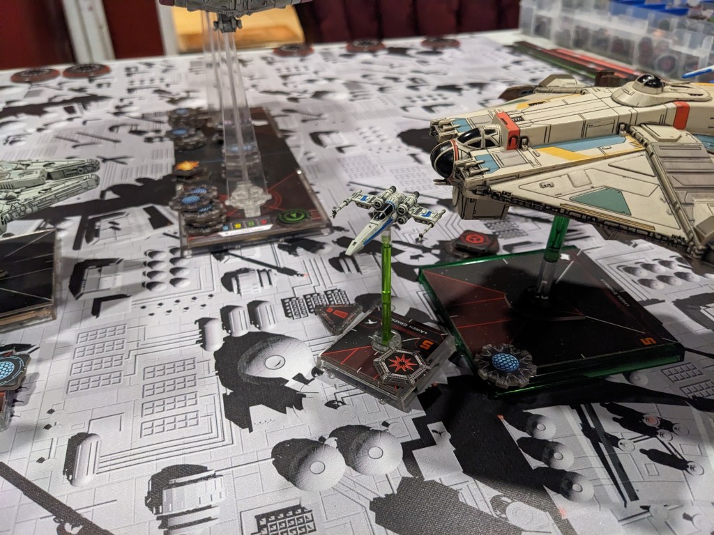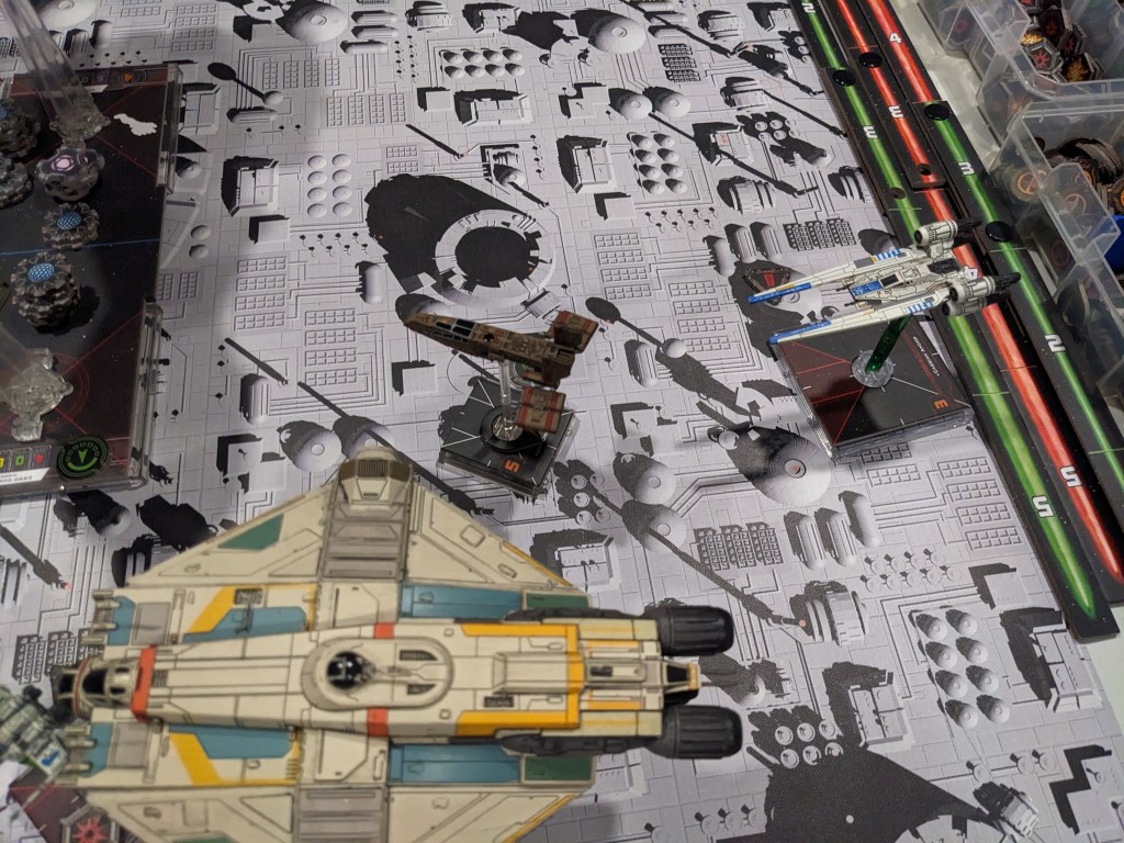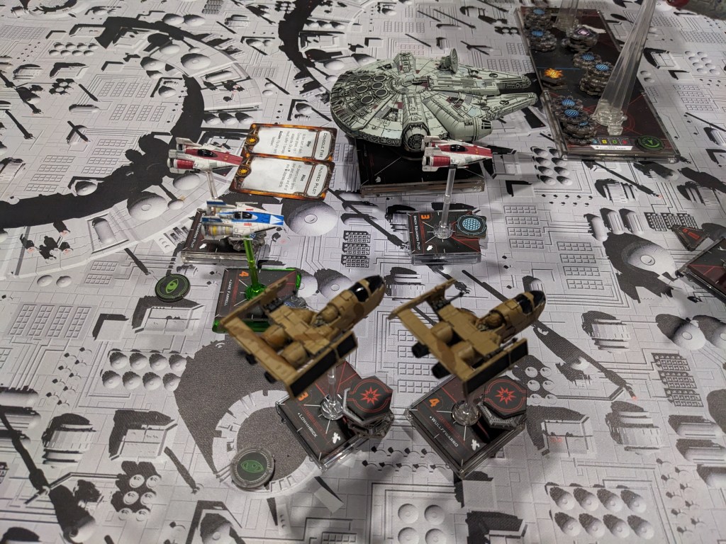 Rebels were scrambling to get their last heavy fighters away from the Raider and out of the cross fire. The A wings by now had spent all of their Proton Rockets and were doing their best to keep the flank locked down by getting in the way and throwing blaster fire at anything that moved. X Wings and the E wing flipped around to get fire on their pursuers.