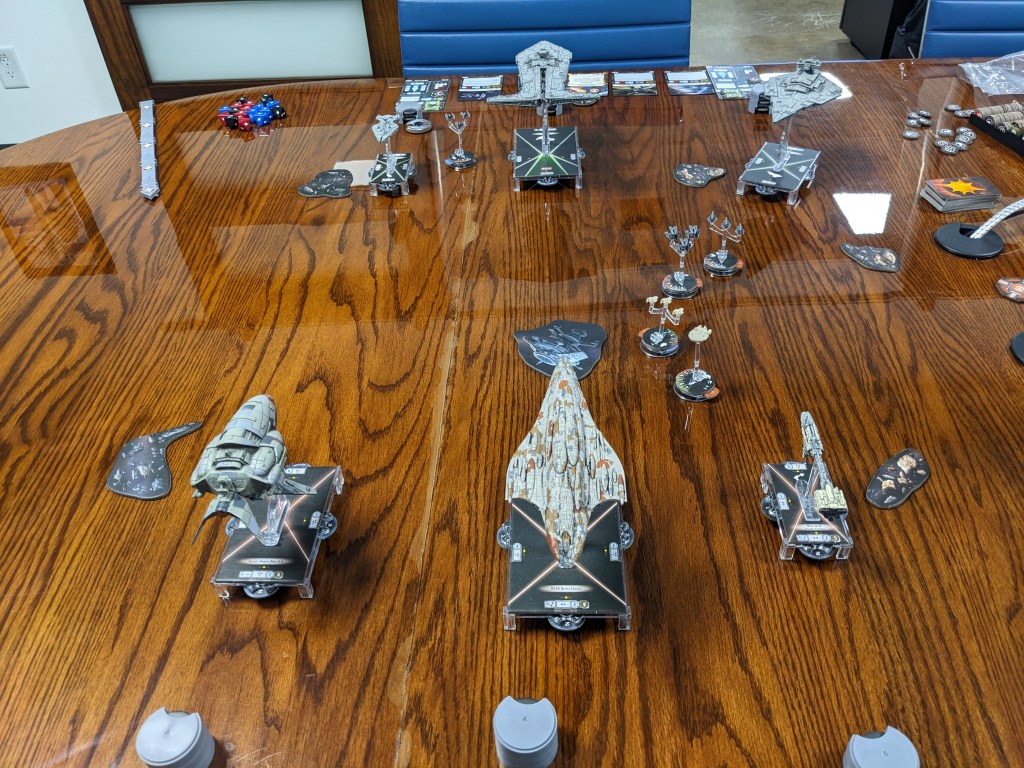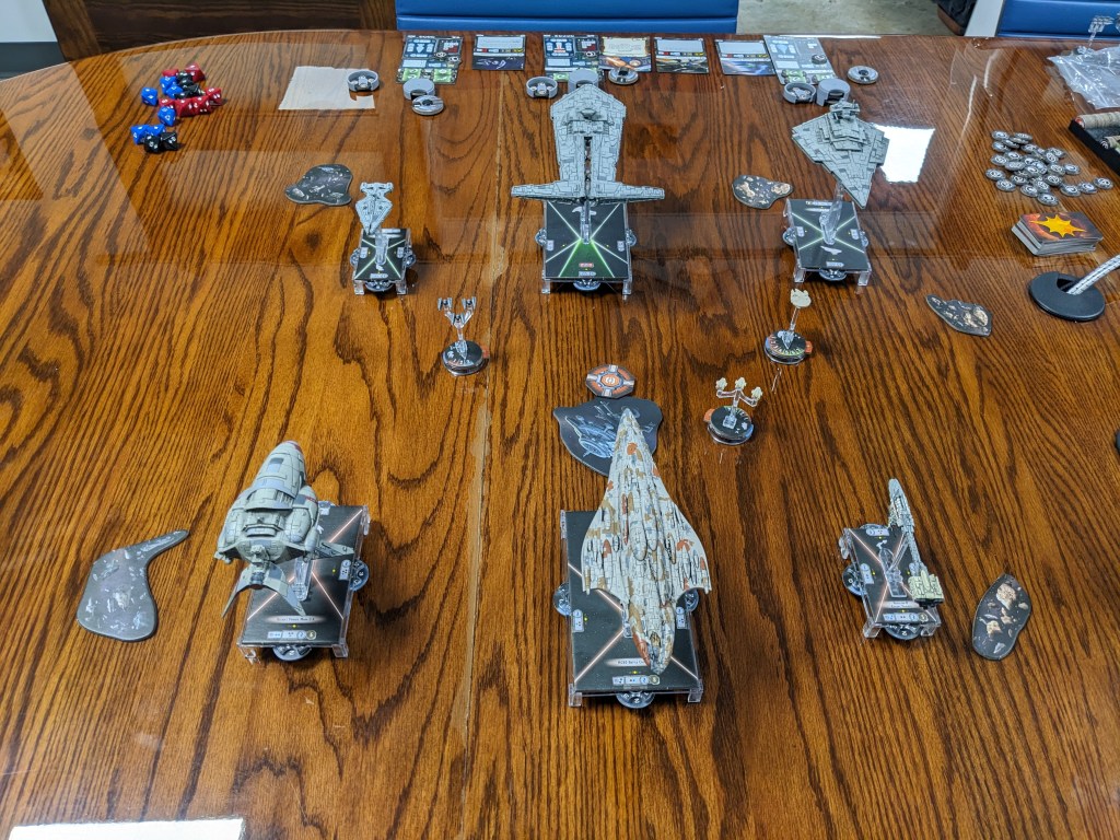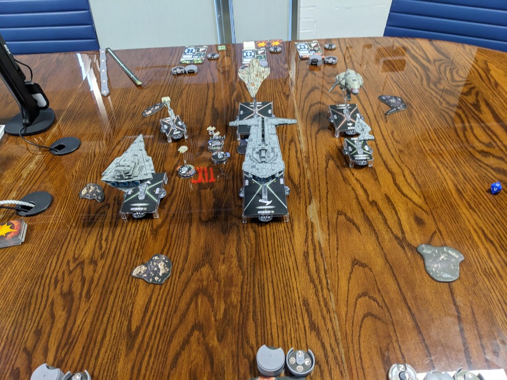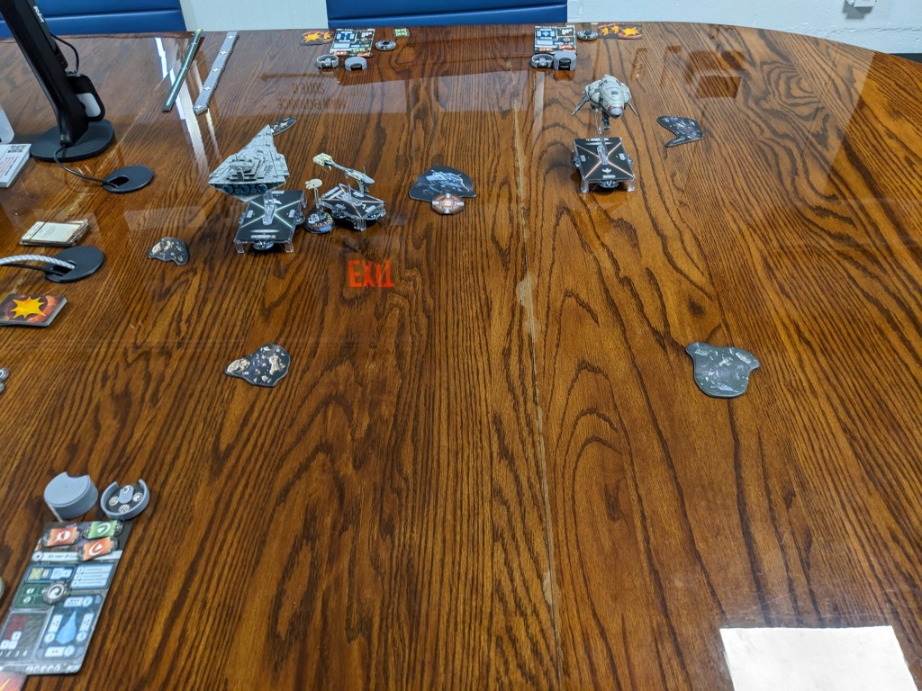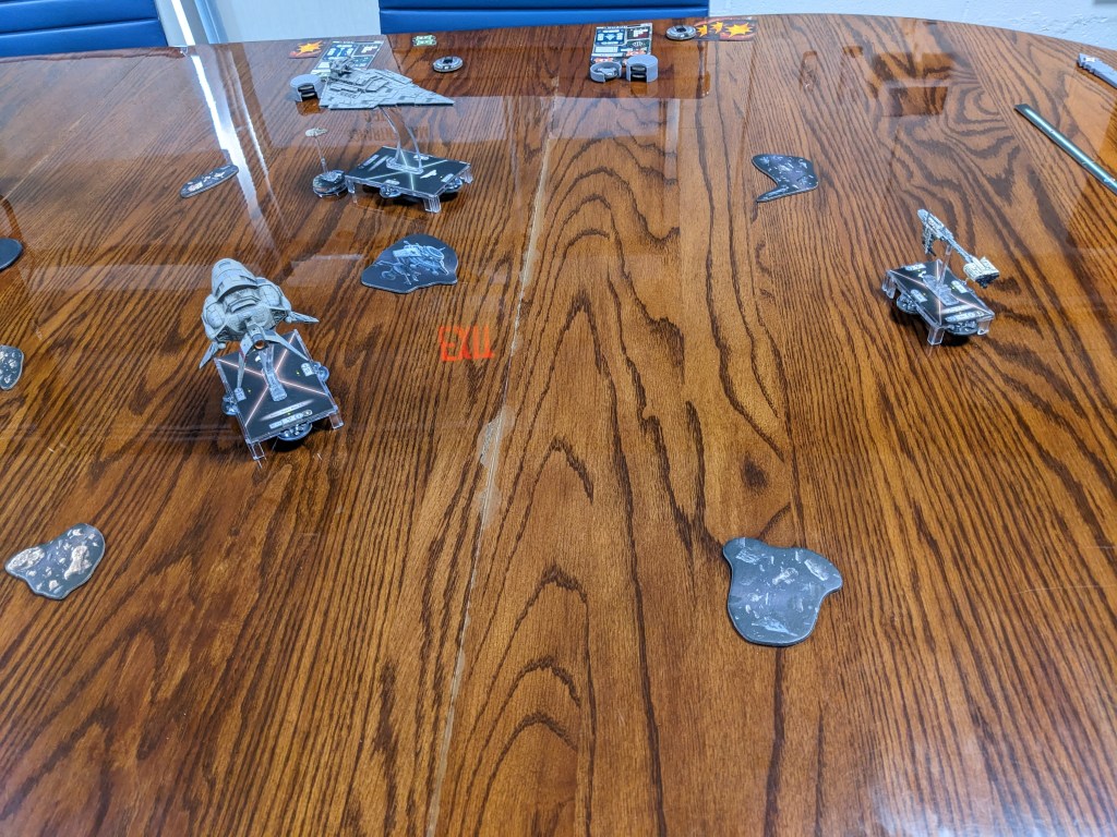 Working on the Friday after Thanksgiving, I knew it would be slow so I brought it into the office to show my coworkers. I hadn’t played in several years and wanted to brush up on the rules myself, so I brought simple loadout ships. On the Rebel side I had a MC80 Assault Cruiser flanked by a Nebulon B and the space chonk. The Empire had the Onager Star Destroyer (I had never used one before and was eager to try it out!) with the classic Victory Class on one flank and an Arquiten on the other.