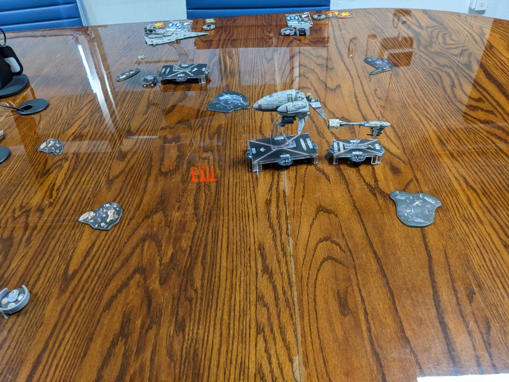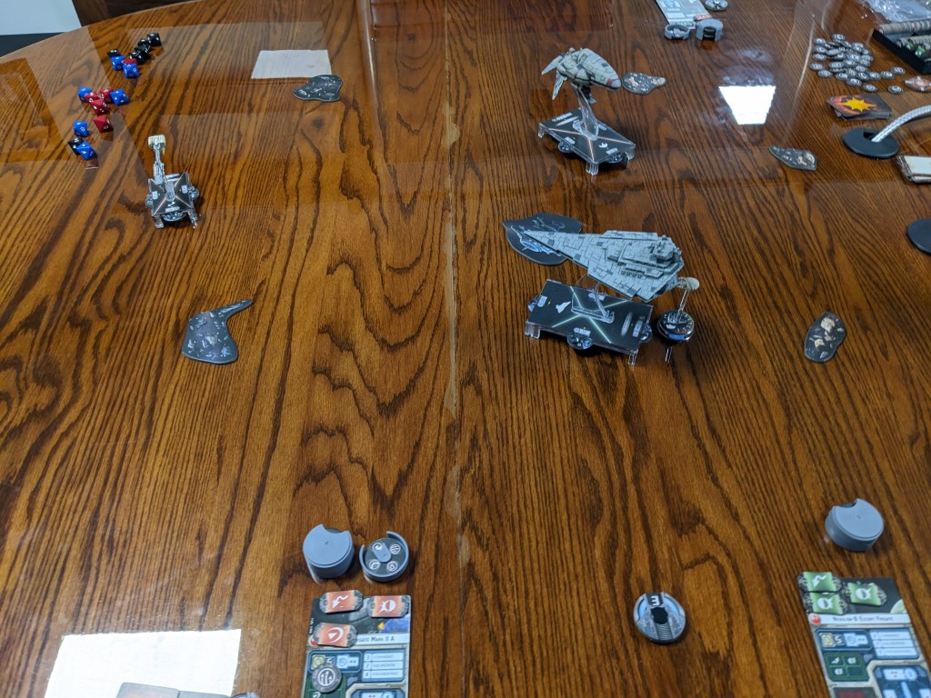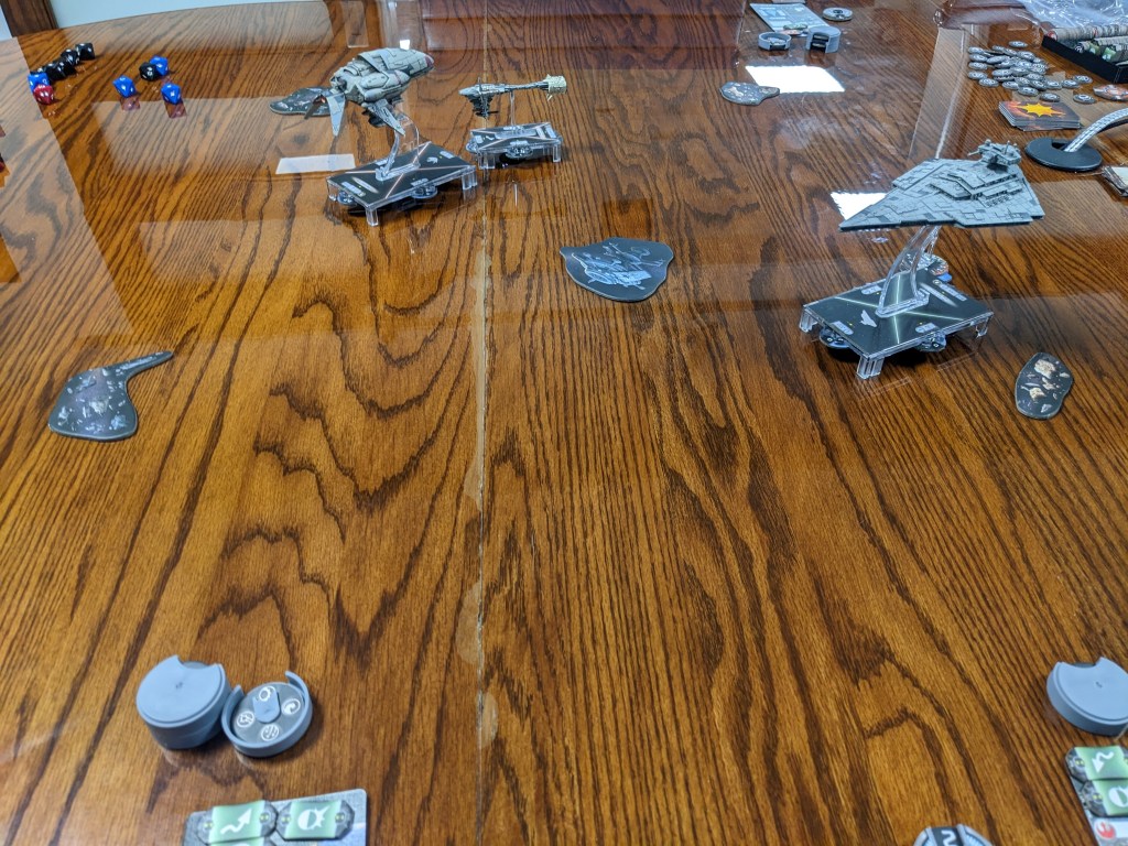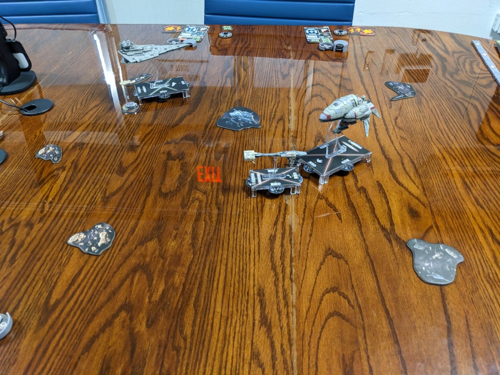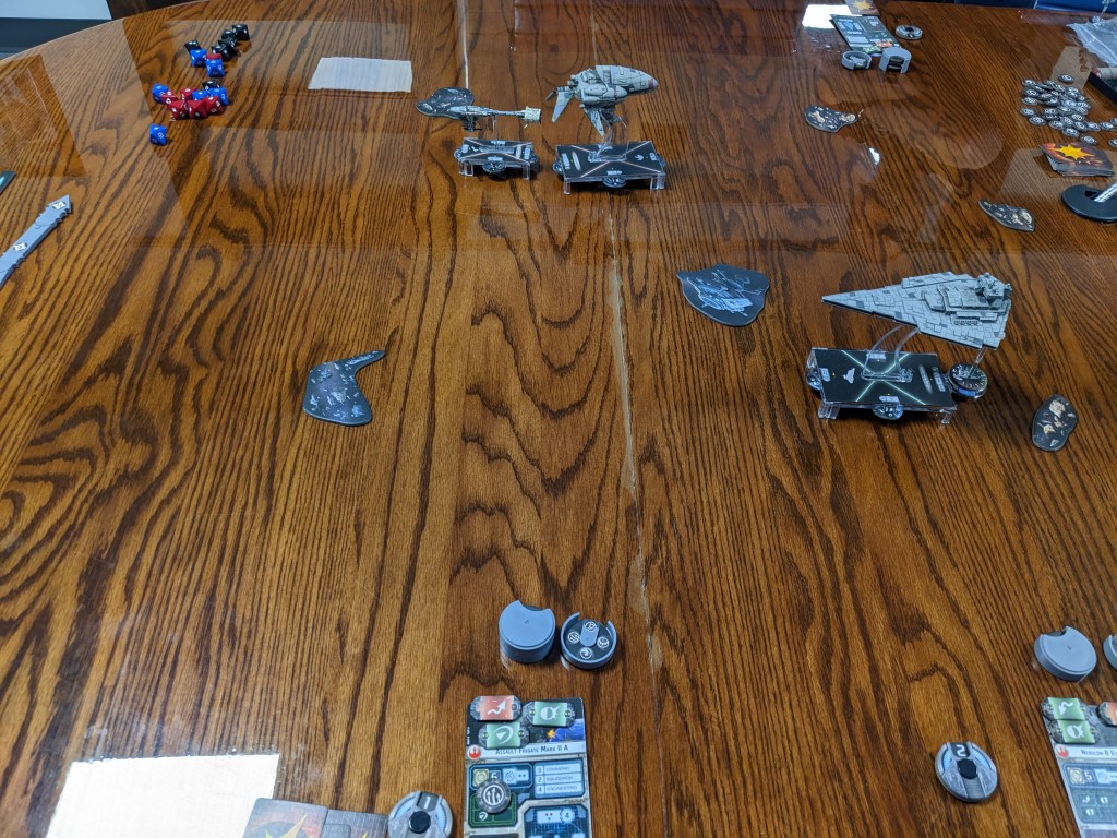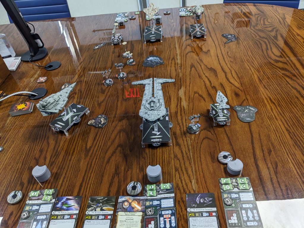 Working on the Friday after Thanksgiving, I knew it would be slow so I brought it into the office to show my coworkers. I hadn’t played in several years and wanted to brush up on the rules myself, so I brought simple loadout ships. On the Rebel side I had a MC80 Assault Cruiser flanked by a Nebulon B and the space chonk. The Empire had the Onager Star Destroyer (I had never used one before and was eager to try it out!) with the classic Victory Class on one flank and an Arquiten on the other.