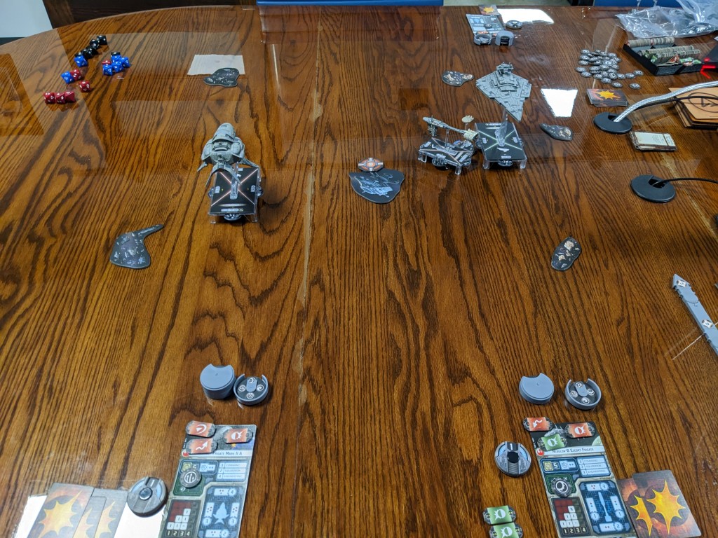 The game started with a slow crawl towards each other. Just showing the basics and highly misunderstanding the Onager (corrected off camera). For those that don’t get it, the Onager special ability and some weapon upgrades throw a token at the weapon range (short by default, with long as the weapon I had selected). From there, on your NEXT turn it fires from the marker itself in any direction so long as it is still in the firing arc! This means the long variant can throw red dice up to 6 range increments away! Or all dice at 4, etc.